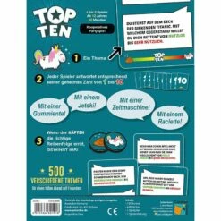 TOP TEN ist ein lustiges Koop-Spiel! Jeder Spieler muss für jedes Thema eine Antwort finden, dabei ist es wichtig, dass eine Antwort seiner geheimen Zahl entspricht. Zum Beispiel muss sich jeder einen Hundenamen ausdenken, der seiner geheimen Zahl entspricht. Dabei ist 1 wenig beeindruckend und 10 richtig furchterregend. Wenn der Captain die Antworten in die richtige Reihenfolge bringt, gewinnt das Team!