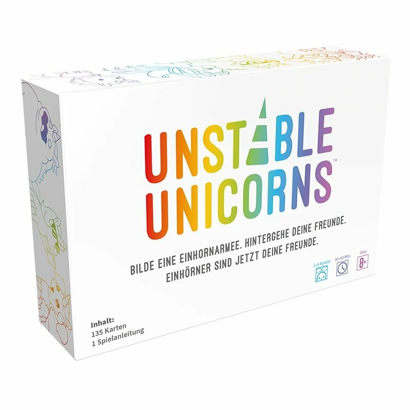 Unstable Unicorns ist ein strategisches Kartenspiel für 2-8 Spieler aus dem Hause Unstable Games, bei dem sich die Spieler ihre eigene Einhorn-Armee aufbauen müssen. In dem Spiel dreht es sich also um jedermanns Lieblingsdinge: Einhörner und Zerstörung. Jeder Spieler startet mit einem Baby-Einhorn im Stall. Aber die Spieler sollten sich nicht zu sehr daran gewöhnen, denn in diesem Spiel sind nicht mal die Baby-Einhörner sicher. Es gibt über 20 magische Einhörner zu sammeln und jedes davon hat seine ganz speziellen Fähigkeiten. Die Spieler müssen ihre Armeen schnellstmöglich aufbauen oder der Zerstörung ins Auge sehen. Dabei gilt es den eigenen Stall mit Magie zu schützen. Klingt einfach? Nicht so schnell! Nur derjenige, der seine Armee als erster aufstellt, darf sich der rechtmäßige Herrscher über alle magischen Dinge nennen… zumindest bis zum nächsten Spiel.