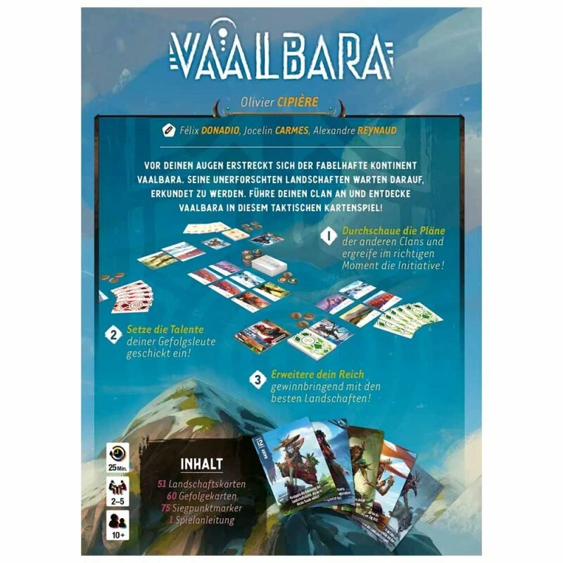 In Vaalbara sammelt jeder Spieler neun Landschaftskarten, vergrößert so das Reich und gewinnt Punkte. Die Spieler müssen die Talente ihrer Gefolgsleute klug einsetzen, um ihr eigenes Reich zu errichten, es weiterzuentwickeln und ihren Einfluss zu stärken. Wer nach neun Runden am meisten Siegpunkte durch seine Landschaften und Siegpunktmarker erlangt hat, gewinnt die Partie.