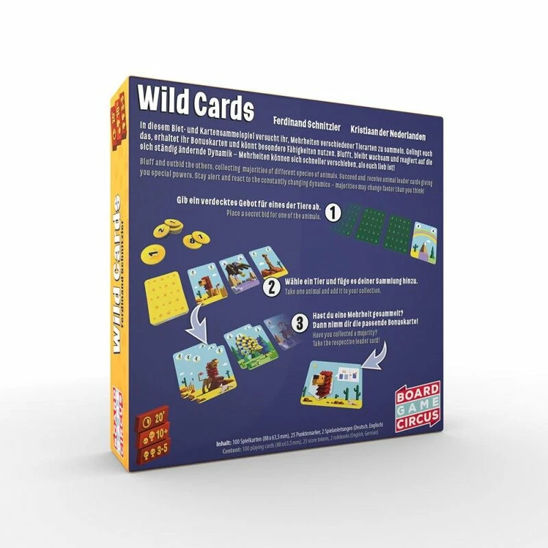 In Wild Cards lockt ihr verschiedene wilde Tiere an, um mit der wertvollsten Sammlung zu gewinnen. Überbietet einander durch cleveres Bluffen, bietet den Tieren ihren natürlichen Lebensraum und sammelt Mehrheiten, um die besonderen Stärken der einzelnen Tierarten zu nutzen.