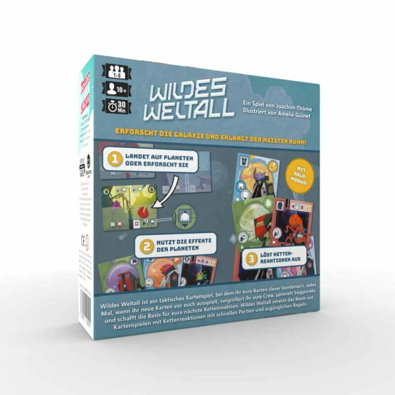 Wildes Weltall ist ein taktisches Kartenspiel, bei dem ihr eure Karten clever kombiniert. Jedes Mal, wenn ihr neue Karten vor euch ausspielt, vergrößert ihr eure Crew, sammelt Siegpunkte und schafft die Basis für eure nächste Kettenreaktion. Wildes Weltall vereint das Beste aus Kartenspielen mit Kettenreaktionen mit schnellen Partien und zugänglichen Regeln.
