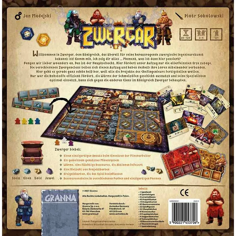 In Zwergar leiten die Spieler einen Zwergenclan, um das unterirdische Königreich auszubauen. Die Spieler platzieren Arbeiter, um Aktionen auszuführen. Während des Zuges bauen die Spieler Rohstoffe aus der Mine ab, verarbeiten sie und setzen damit Projekte um, die Siegpunkte und verschiedene zusätzliche Boni bringen.